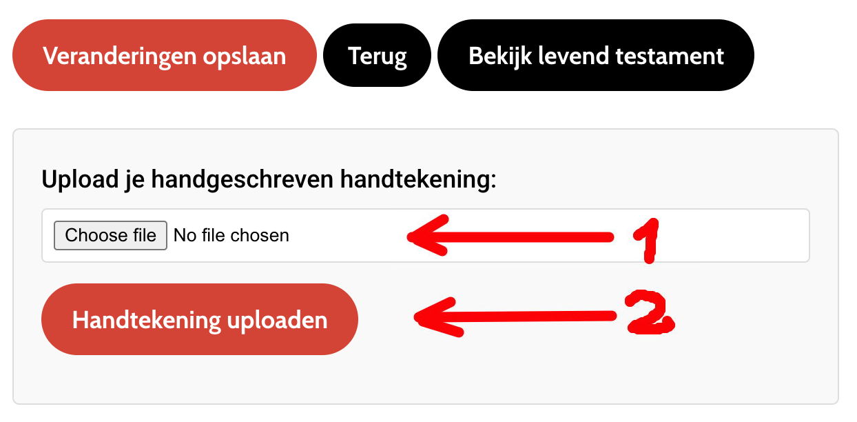 Zodra u uw wijzigingen hebt opgeslagen, kunt u een gescande handtekening uploaden. Om dit te doen, selecteert u het bestand dat uw handtekening bevat (1, Choose file) en klikt u vervolgens op “Handtekening uploaden (2)”. Zodra u het bericht “Handtekening succesvol geüpload” ziet, is uw levenstestament up-to-date.